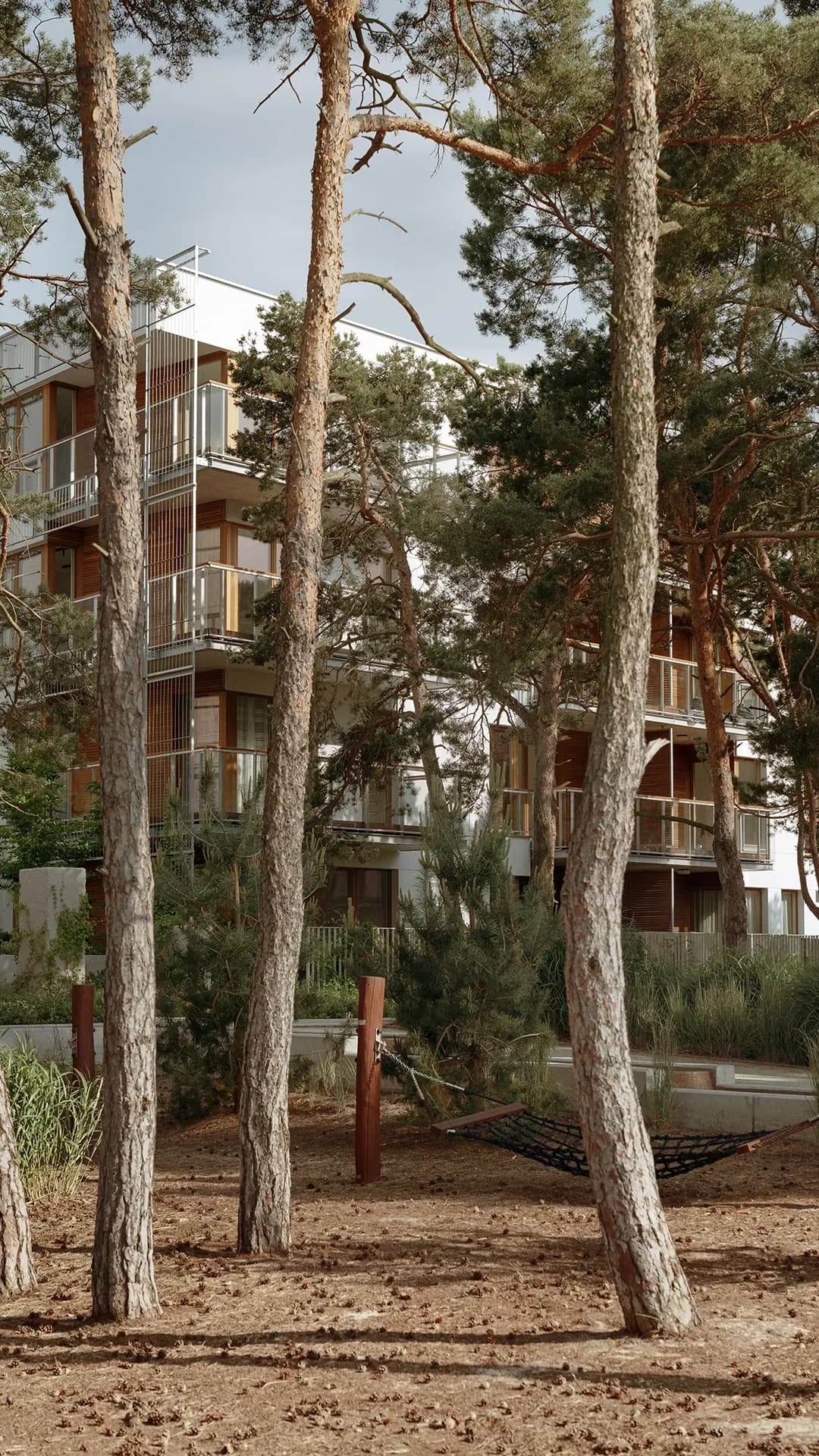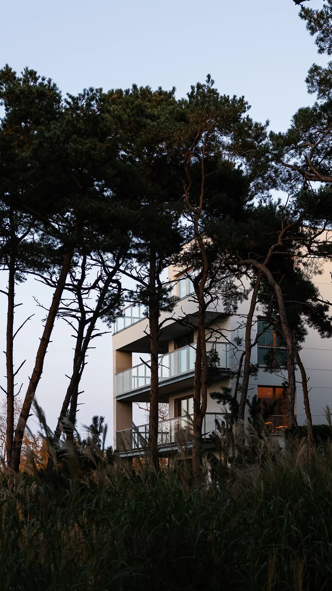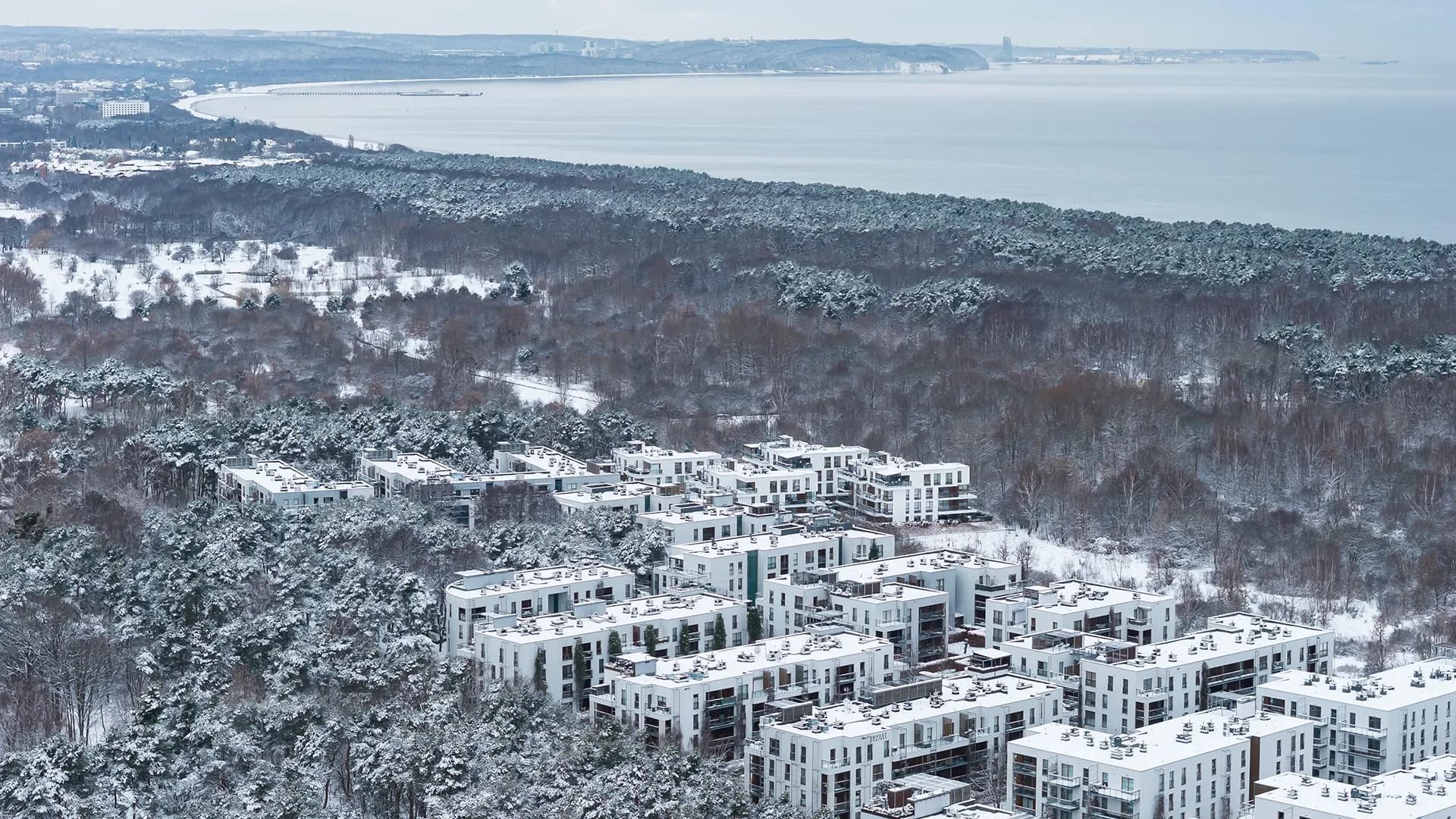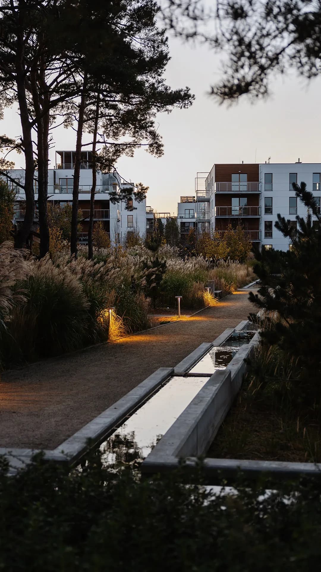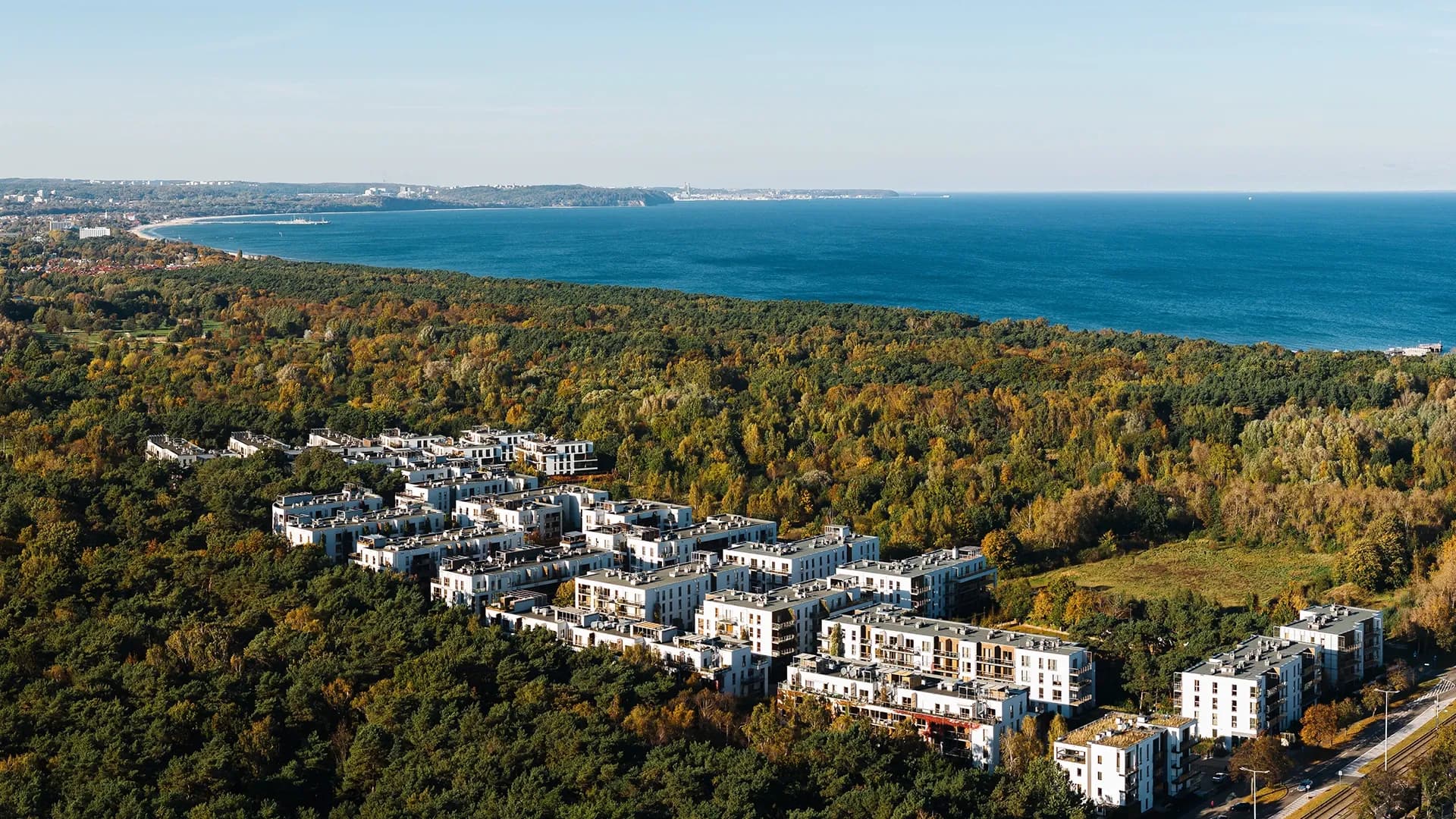- Ewoluujący mikroklimat: Ponad stuletni, zachowany drzewostan jest dopełniony starannie dobraną roślinnością, tworząc na terenie osiedla bujną łąkę. Bogactwo runa leśnego, traw, krzewów ozdobnych oraz kwitnąca polana na dachu budynku fitness nie tylko stanowią dekorację, ale także stwarzają unikalny mikroklimat, który żyje, rośnie i ewoluuje. Sam kompleks, chociaż kameralny i celowo niski, właścicielom rezydencji na najwyższych poziomach oferuje rozpościerający ponad koronami drzew widok na Bałtyk.