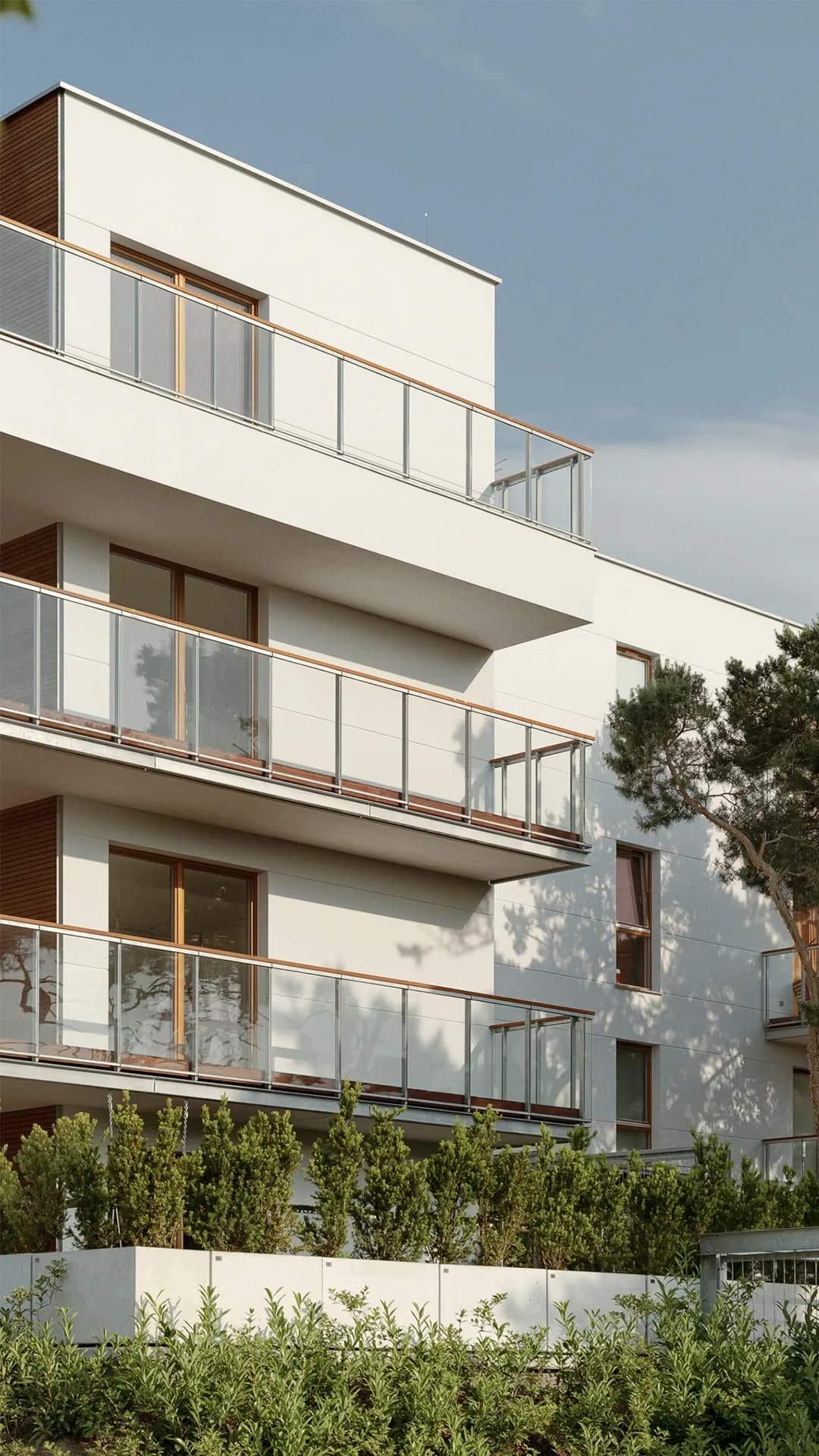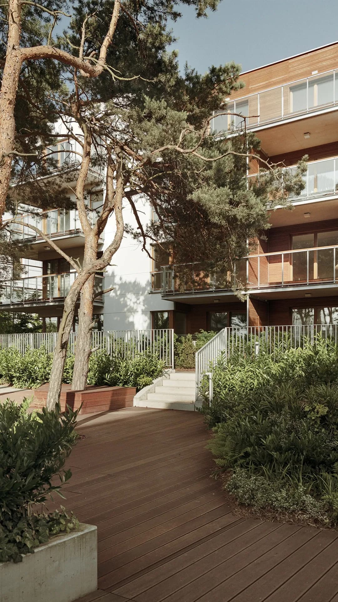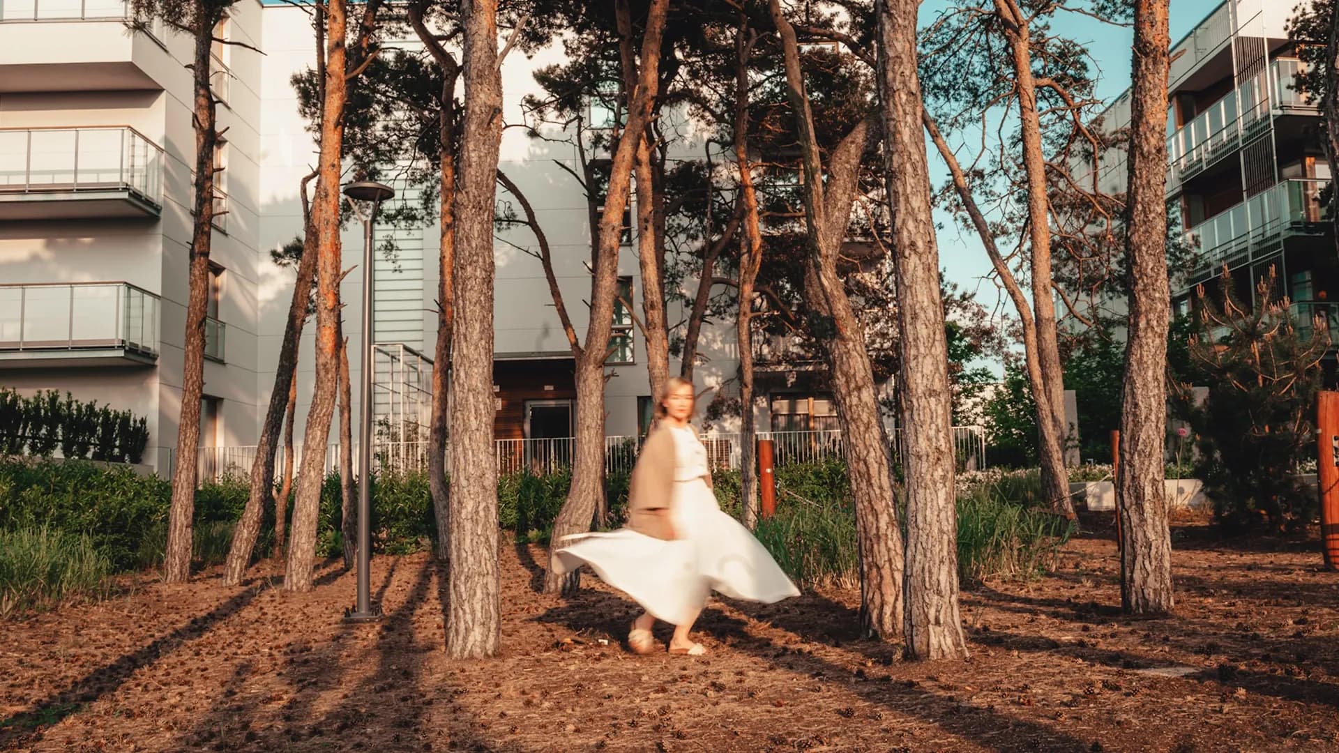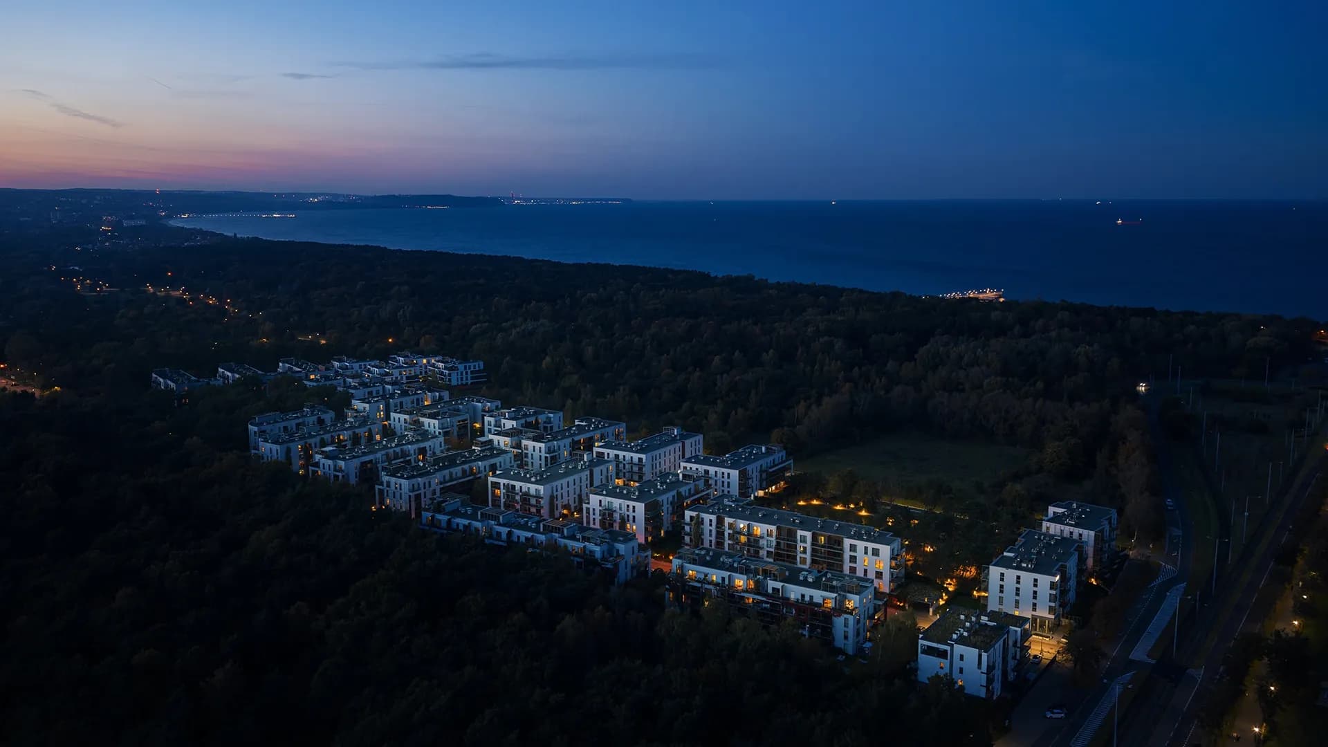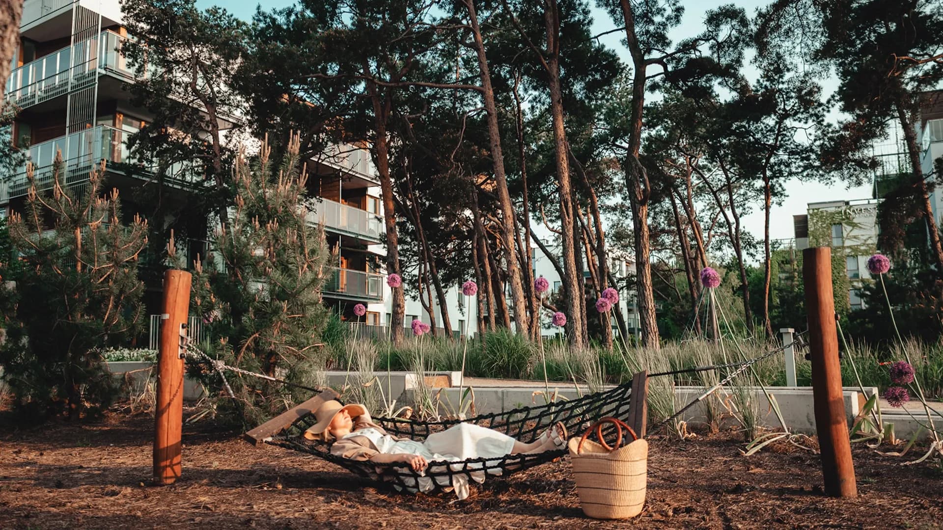 - Ewoluujący mikroklimat: Ponad stuletni, zachowany drzewostan jest dopełniony starannie dobraną roślinnością, tworząc na terenie osiedla bujną łąkę. Bogactwo runa leśnego, traw, krzewów ozdobnych oraz kwitnąca polana na dachu budynku fitness nie tylko stanowią dekorację, ale także stwarzają unikalny mikroklimat, który żyje, rośnie i ewoluuje. Sam kompleks, chociaż kameralny i celowo niski, właścicielom rezydencji na najwyższych poziomach oferuje rozpościerający ponad koronami drzew widok na Bałtyk.