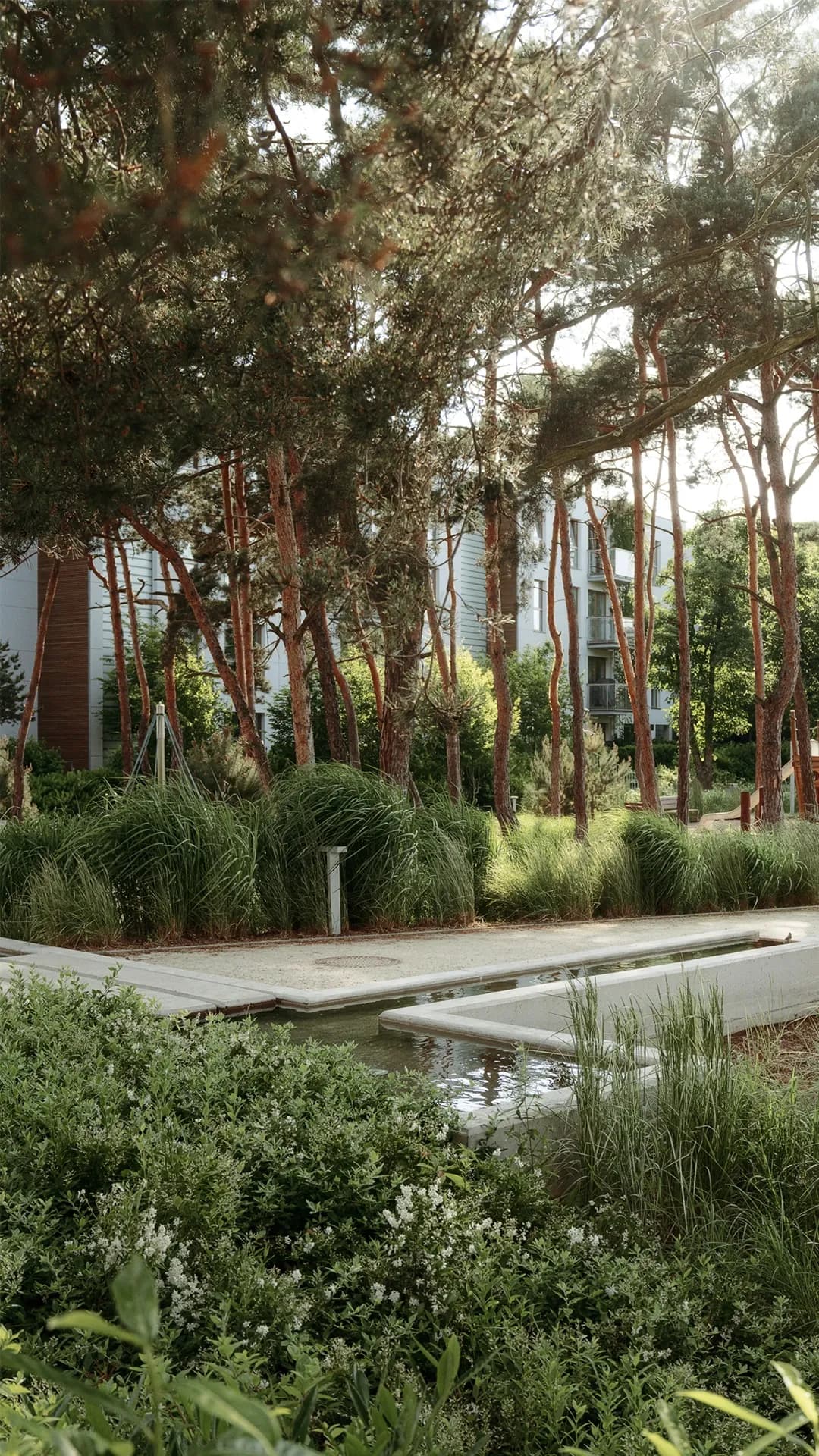 - Natura najpierw: Wielopniowe drzewa oraz pnącza zdobiące elewacje budynków są nowoczesną interpretacją ogrodu wertykalnego, pozwalając minimalistycznej bryle przenikać się z soczystą roślinnością. Sercem Nadmorskiego Dworu jest jednak założenie wodne, płynące między budynkami i zwieńczone kaskadą, które dyskretnym szumem podkreśla bliską relację z parkowym otoczeniem.