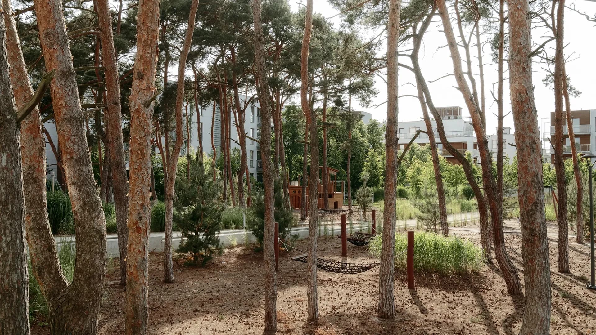 - Relacje, relaks, regeneracja: Kompleks rezydencjalny otoczony jest przestronnymi terenami zielonymi służącymi jako prywatny park. Otwarta przestrzeń piknikowa z ławami i stołami stanowi wprost idealne miejsce do zewnętrznej integracji sąsiedzkiej i relaks tak totalny, że wolny od wszelkich wyrzutów sumienia. Amatorzy aktywności z pewnością docenią wielofunkcyjną polanę – w pogodne dni można tutaj organizować zawody badmintona lub siatkówki. Dla dzieci z kolei przygotowano aż trzy place zabaw z różnorodnymi i bezpiecznymi konstrukcjami: rozległą piaskownicę, siatkę wspinaczkową oraz drewniany statek piracki, zachęcające do rozwoju kreatywności na świeżym powietrzu.