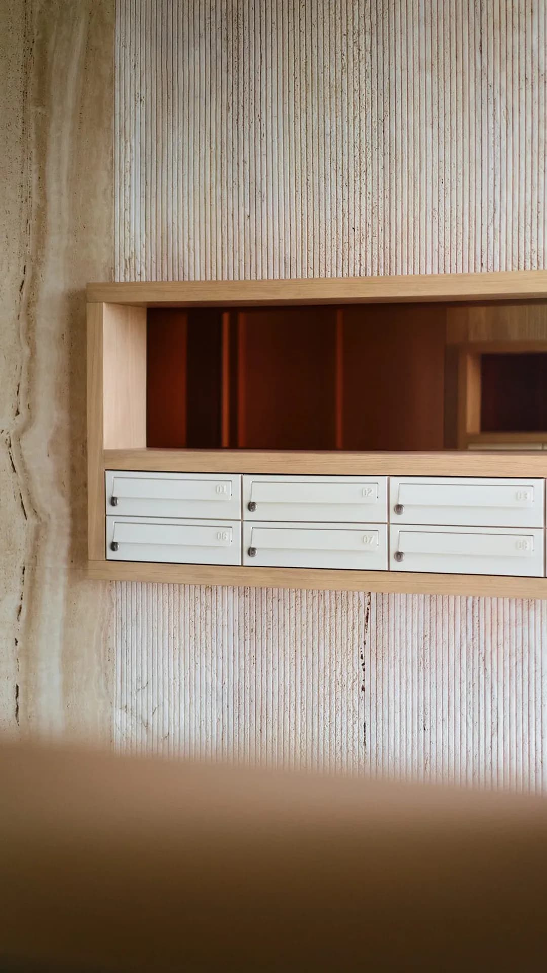 - Wysoka jakość wykończenia i wyposażenia części wspólnych: trawertyn, fornir