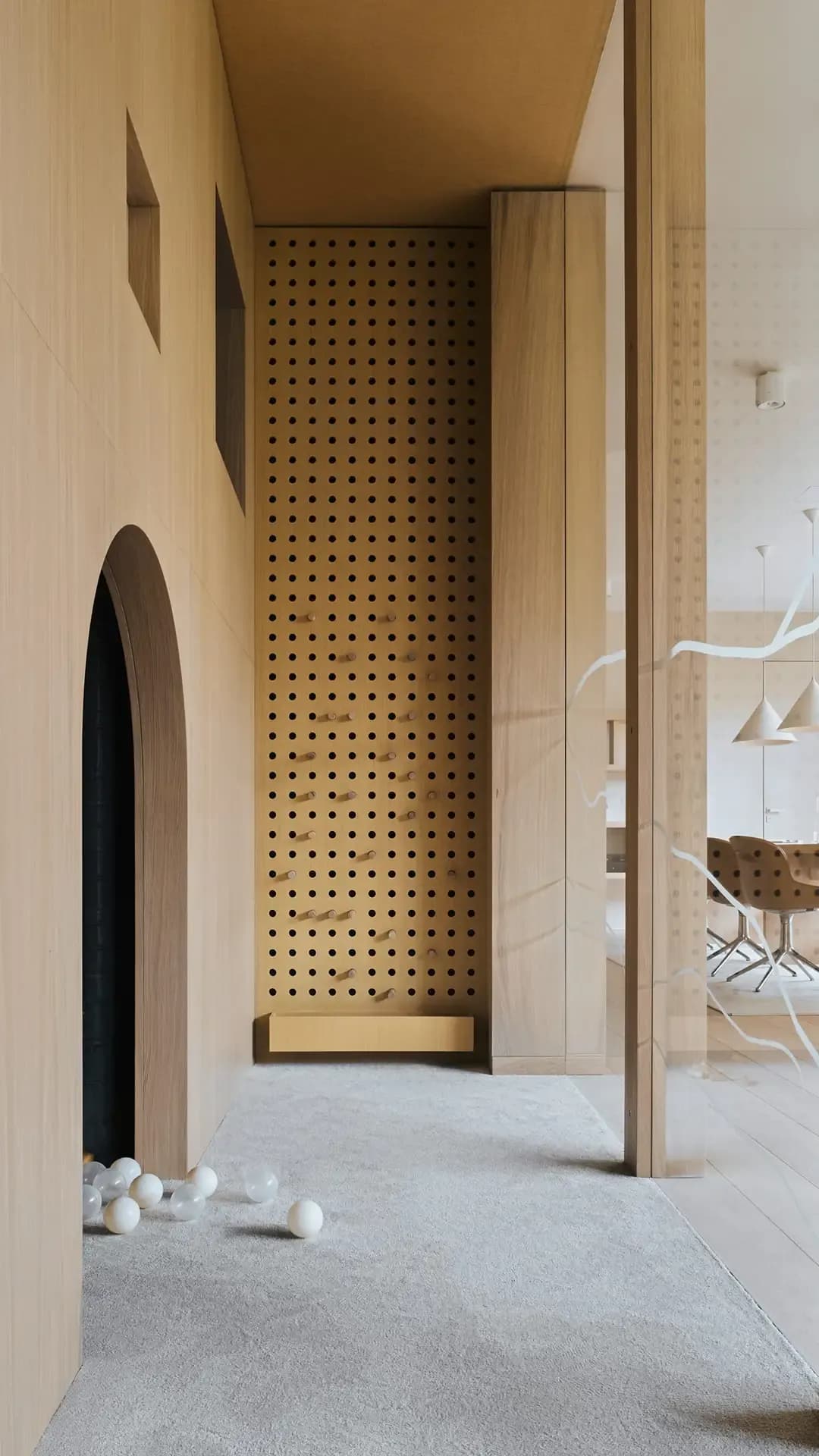 - Natura od środka: Wnętrza Nadmorskiego Dworu również odzwierciedlają przywiązanie do tutejszej przyrody – łączą bezwarunkową funkcjonalność z organiczną i botaniczną estetyką. Mieszkańcy mają do dyspozycji prywatną, profesjonalną i utrzymaną w kojącej kolorystyce siłownię, gdzie surowy beton złamano fakturą odciśniętych w nim drewien. Także komfortowe sauny (sucha i mokra) zlokalizowane są w tym wydzielonym, harmonijnie wtopionym w skarpę budynku. Przestrzeń co-workingowa zapewnia jak najpełniejsze odcięcie od bodźców zewnętrznych – tak niezbędne do pracy i… może jednocześnie służyć jako sala klubowa do spotkań towarzyskich, sąsiedzkich oraz eventów. Natomiast znajdująca się za przeszkleniem strefa szaleństw dla najmłodszych jest bogato wyposażona w ekologiczne zabawki, urządzenia interaktywne oraz regał z niszowymi książkami, które wprost przyciągają swoją zachwycającą formą. To stwarza doskonałe warunki do rozwoju i zabawy najmłodszych, a ich rodzicom daje najważniejsze – spokój o ich bezpieczeństwo.