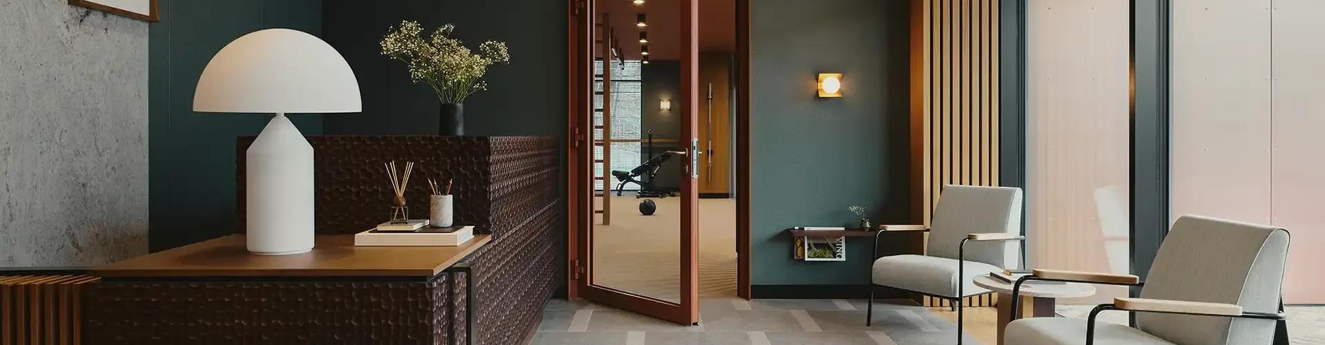 Tutaj wysokogatunkowe drewno, surowa miedź, granit i metal łączą się ze szlachetnymi tkaninami i niebanalnymi tapetami. Ręcznie robione meble oraz drewniana rzeźba autorstwa Anny Bery dyskretnie wypełniają przestronne, reprezentacyjne lobby z recepcją. A budynek wieńczy przestrzeń wspólna oferująca to, co może zaoferować ta lokalizacja: widok na lasy i panoramę miasta.